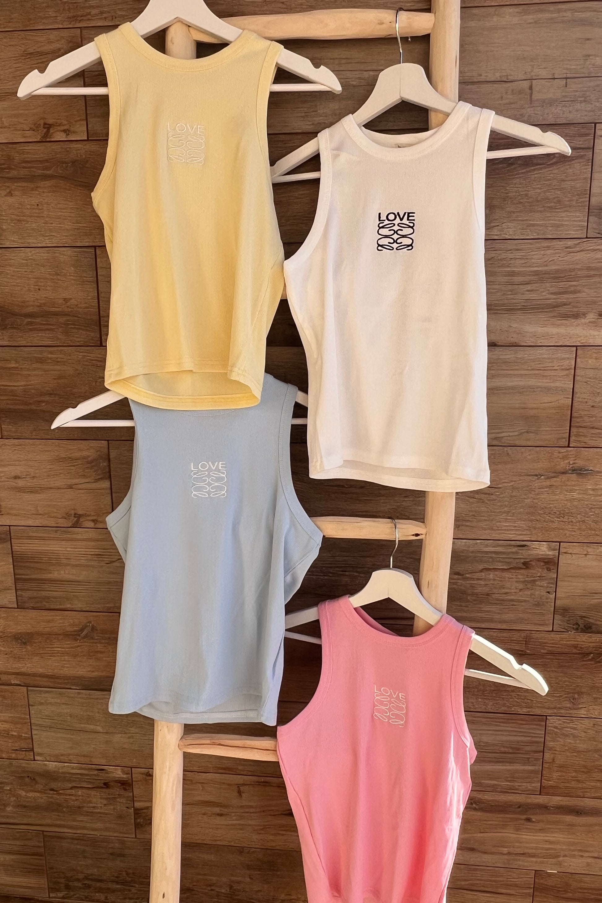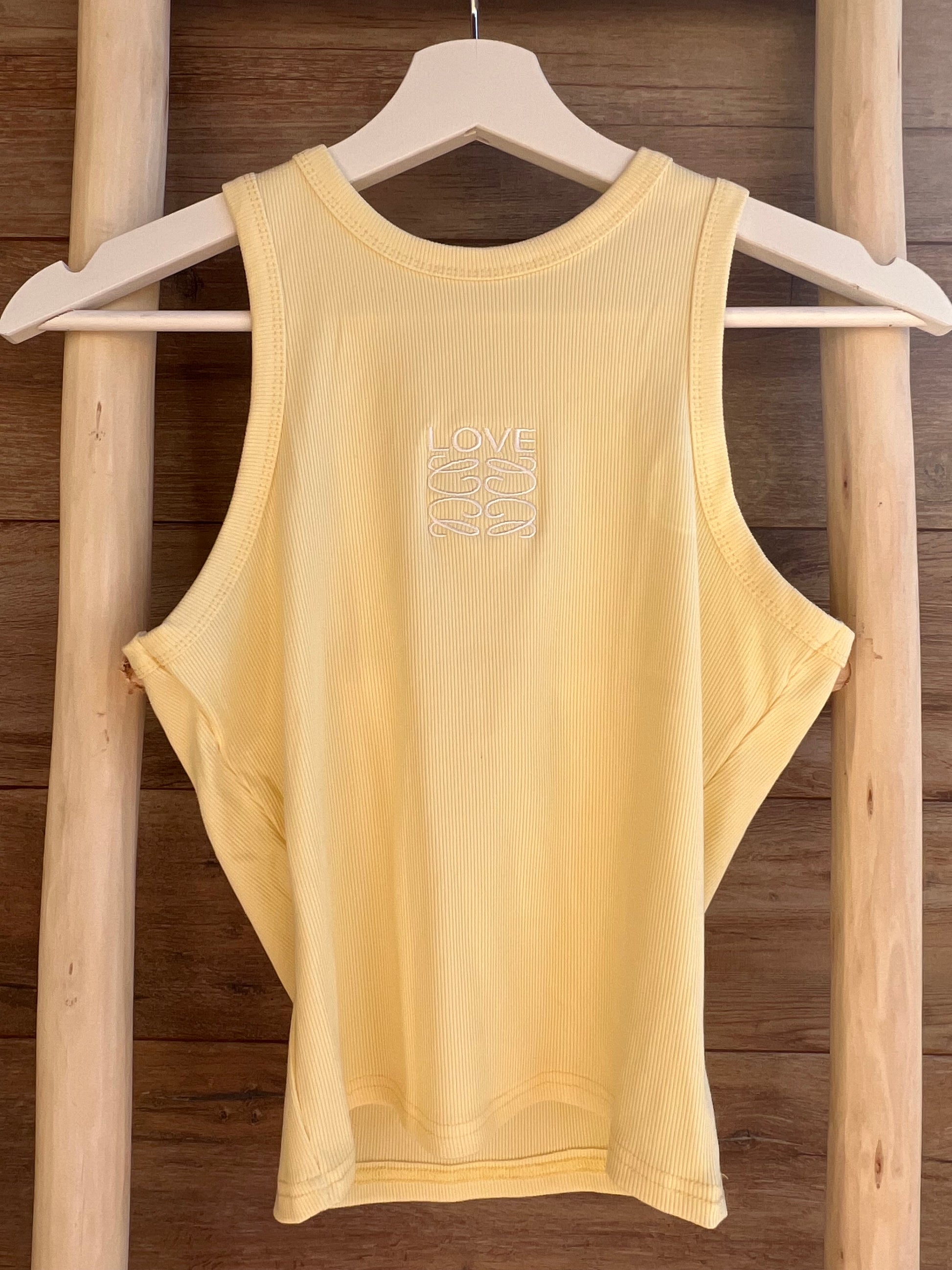 Camiseta sin mangas de canalé, ajustado y cómodo. Diseño minimal con el detalle “LOVE” en el centro que le da un toque único. Ideal para looks casuales o sporty.