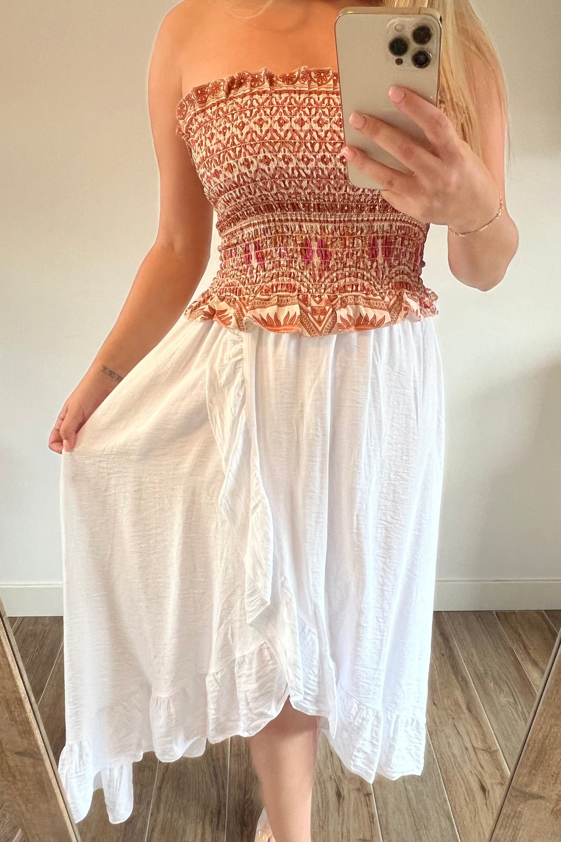 Confeccionada en un tejido ligero y vaporoso, su corte midi con vuelo y detalle asimétrico aporta un toque bohemio y desenfadado perfecto para los días de sol. La cintura elástica asegura una adaptación cómoda al cuerpo, realzando la silueta sin perder libertad de movimiento.