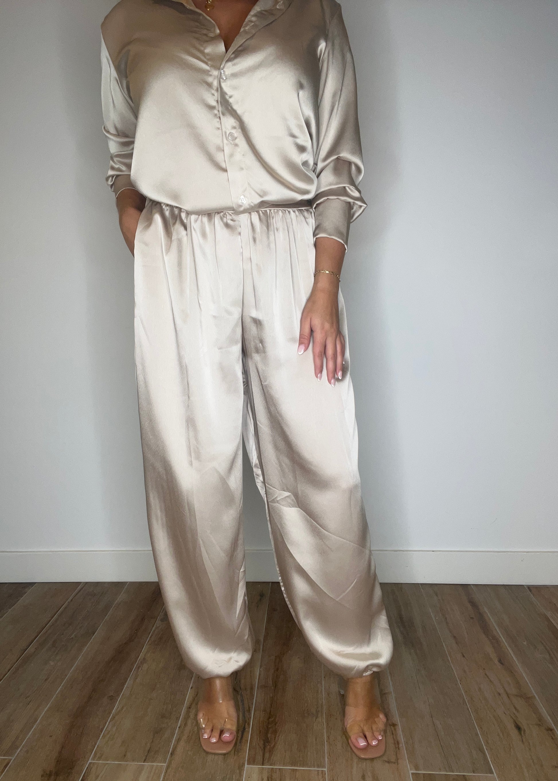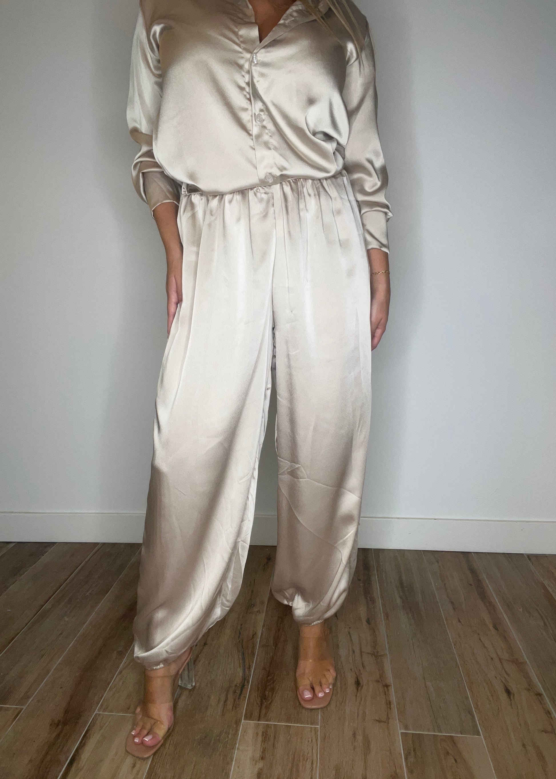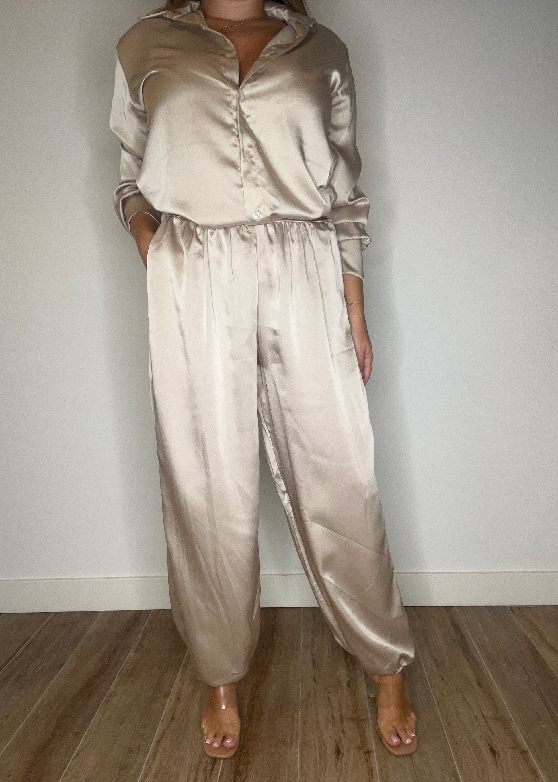 El Pantalón Bombacho champán es de talla única y está hecho de raso. Con su diseño bombacho, este pantalón es cómodo y moderno para cualquier ocasión. Su tela de raso lo hace elegante y fácil de combinar con cualquier prenda. ¡Luce a la moda con este pantalón único!