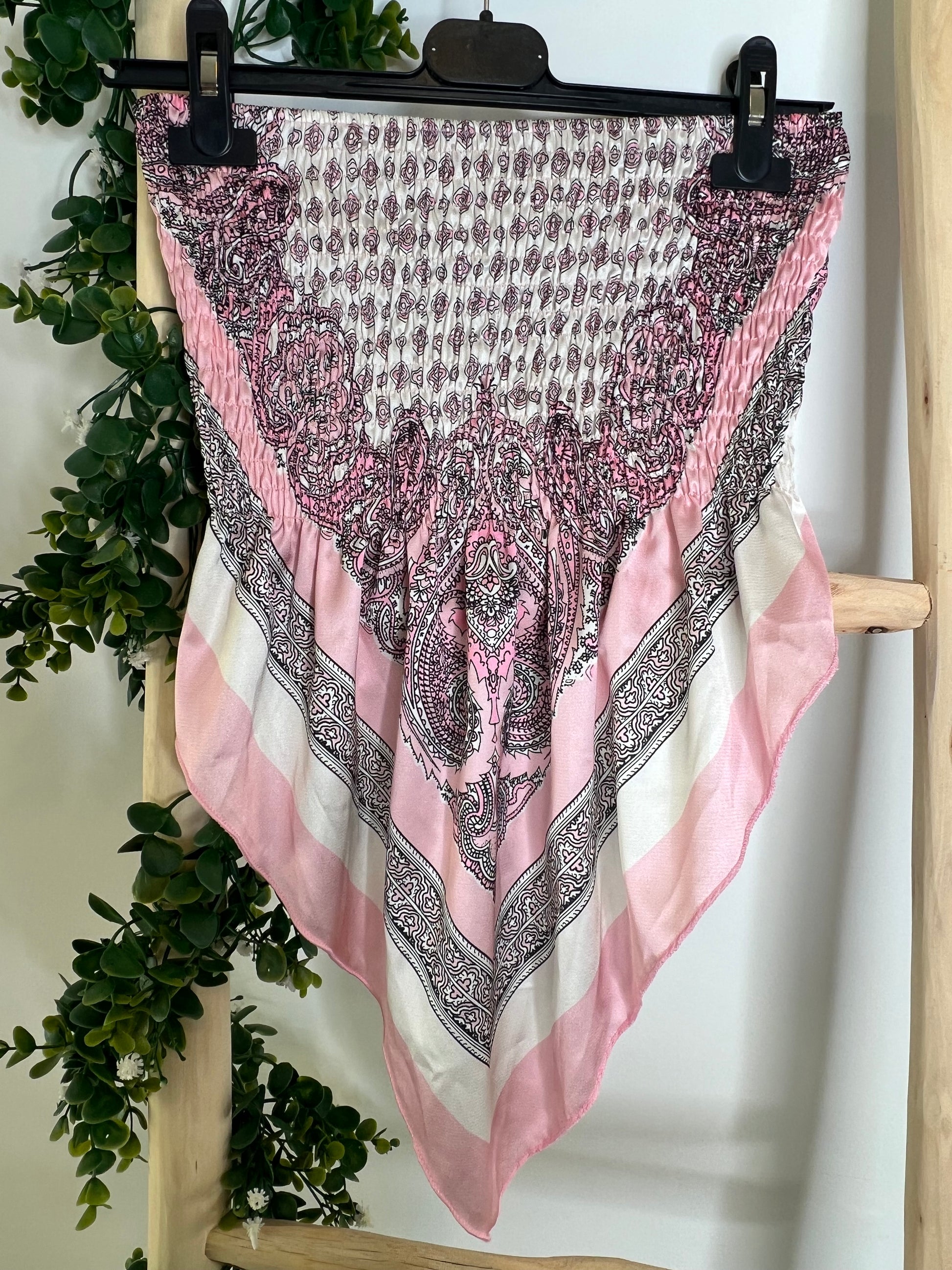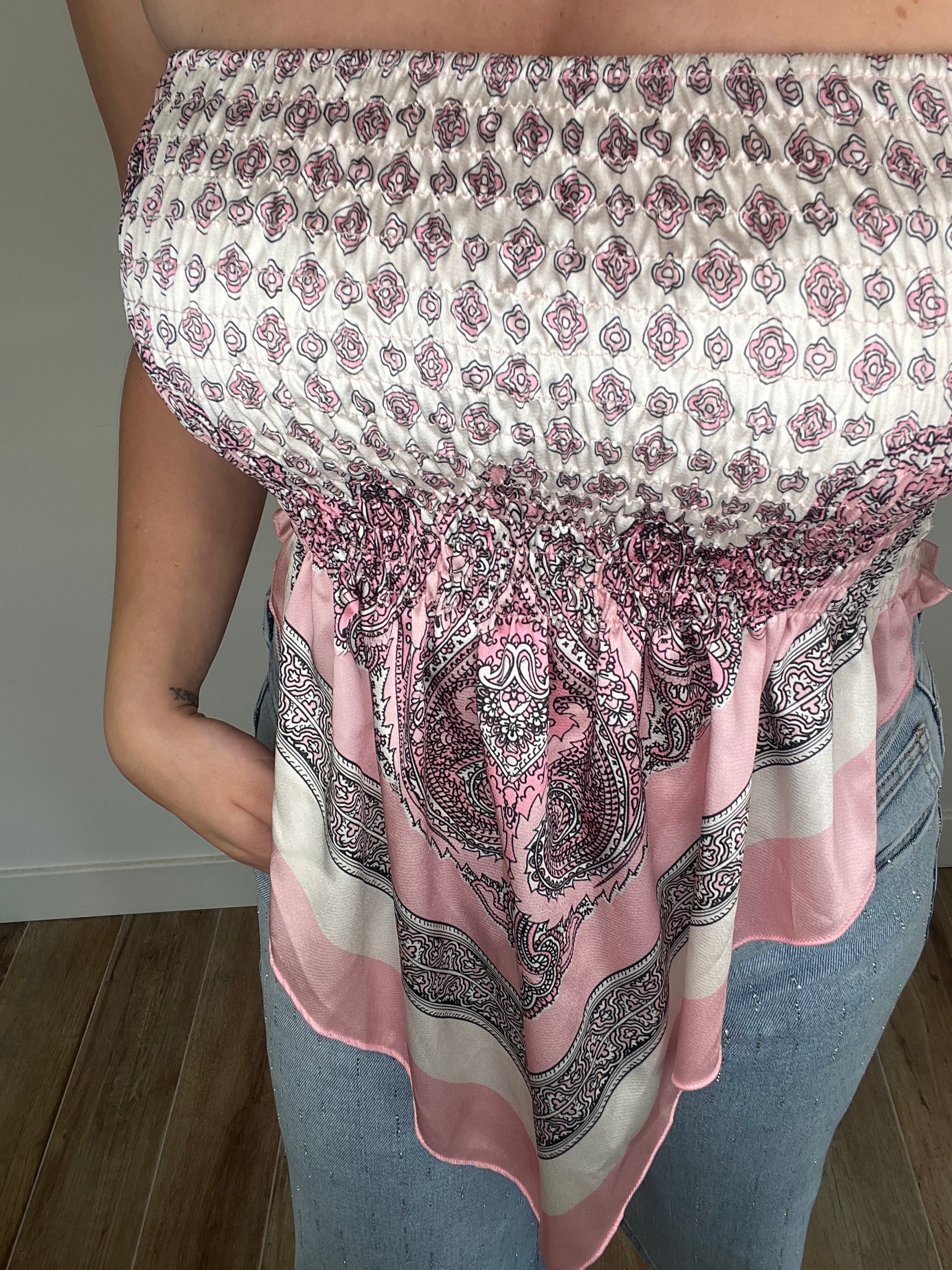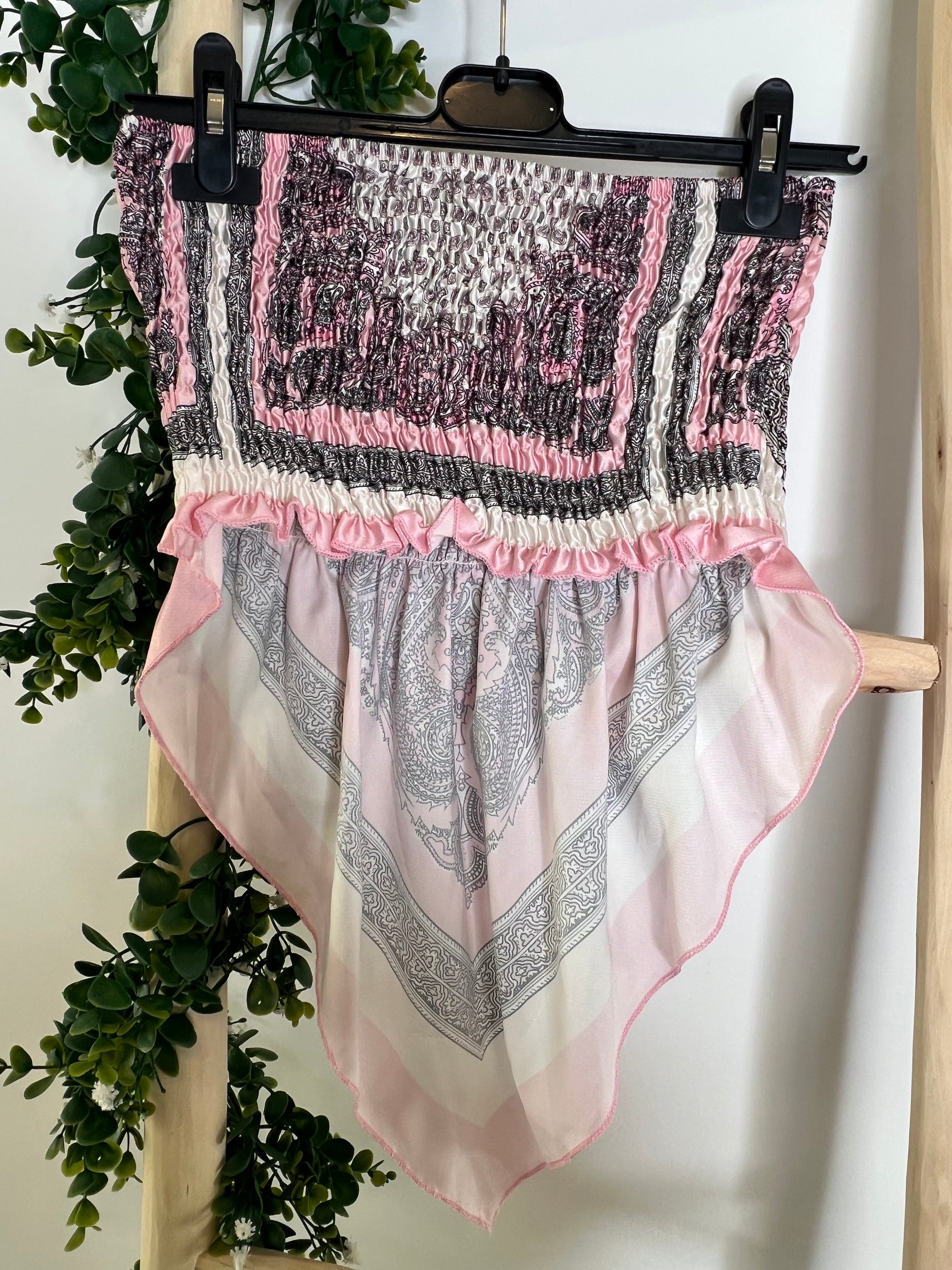 Top que transforma cualquier look con solo ponértelo. De inspiración boho chic, su diseño tipo pañuelo con estampado en tonos vibrantes le da un aire exótico y muy favorecedor.