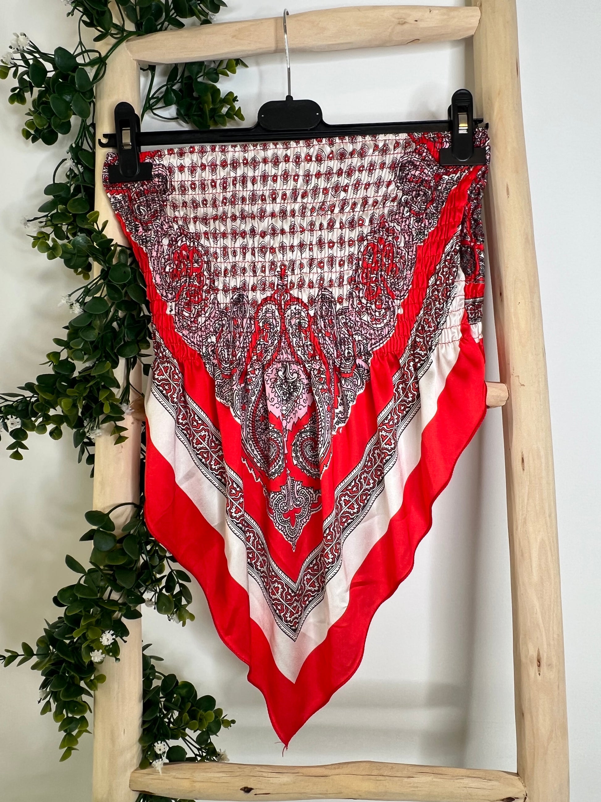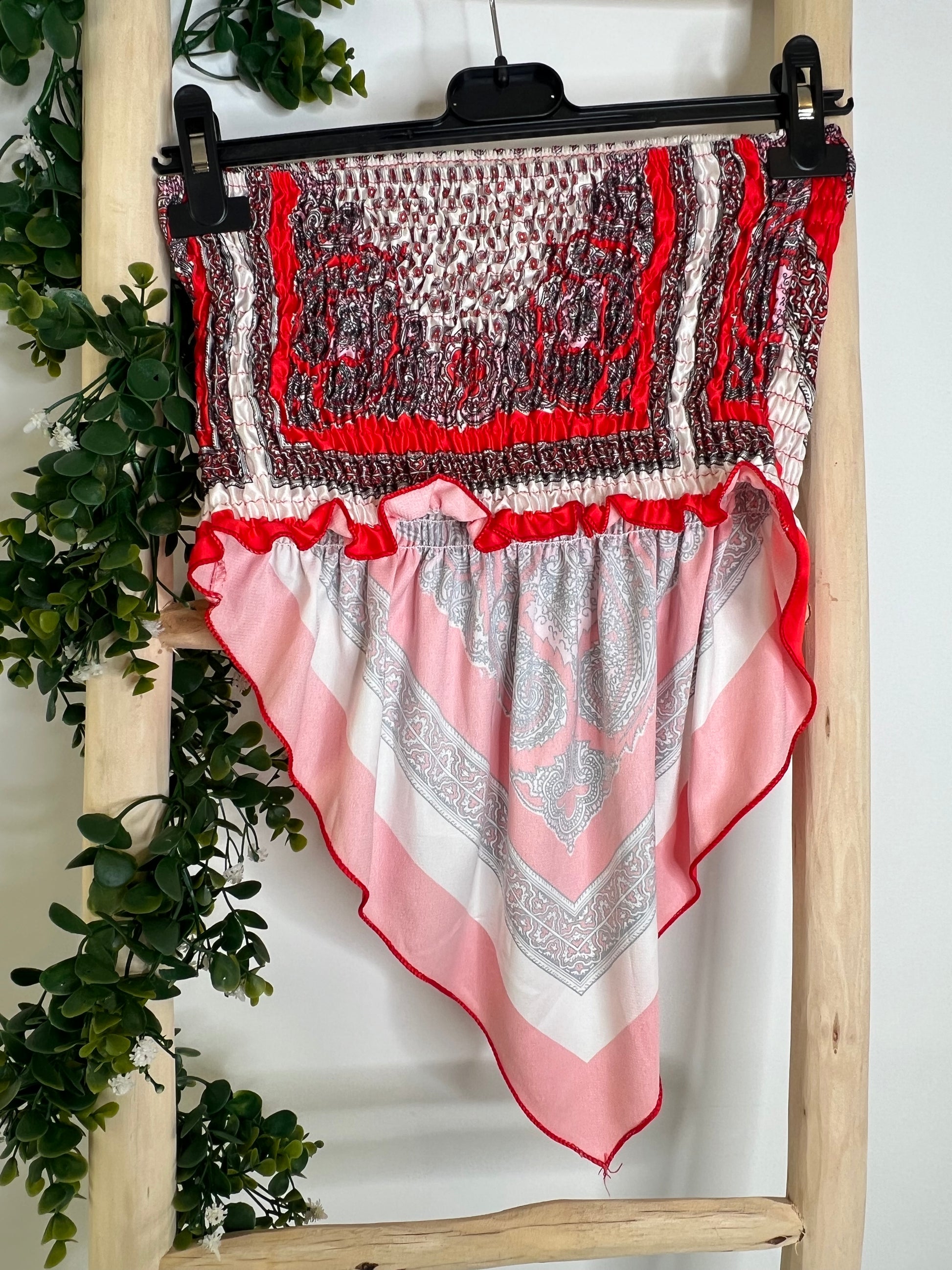 Top que transforma cualquier look con solo ponértelo. De inspiración boho chic, su diseño tipo pañuelo con estampado en tonos vibrantes le da un aire exótico y muy favorecedor.