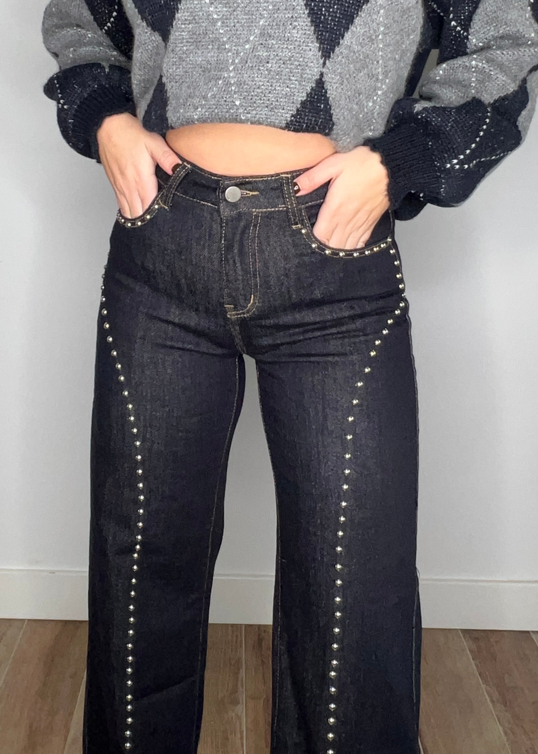 El vaquero wide leg con detalles en tachuela es la elección perfecta para lucir con estilo y comodidad. Su corte ajustado en la cintura y tiro alto estiliza la figura, mientras que las tachuelas añaden un toque moderno. Hazte con este vaquero para un look impecable.